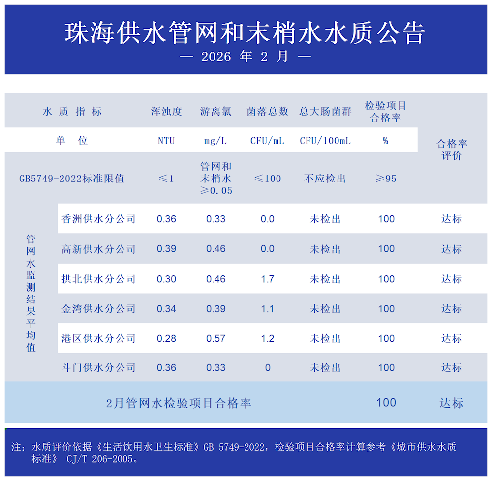 2026年2月珠海供水管网和末梢水水质公告