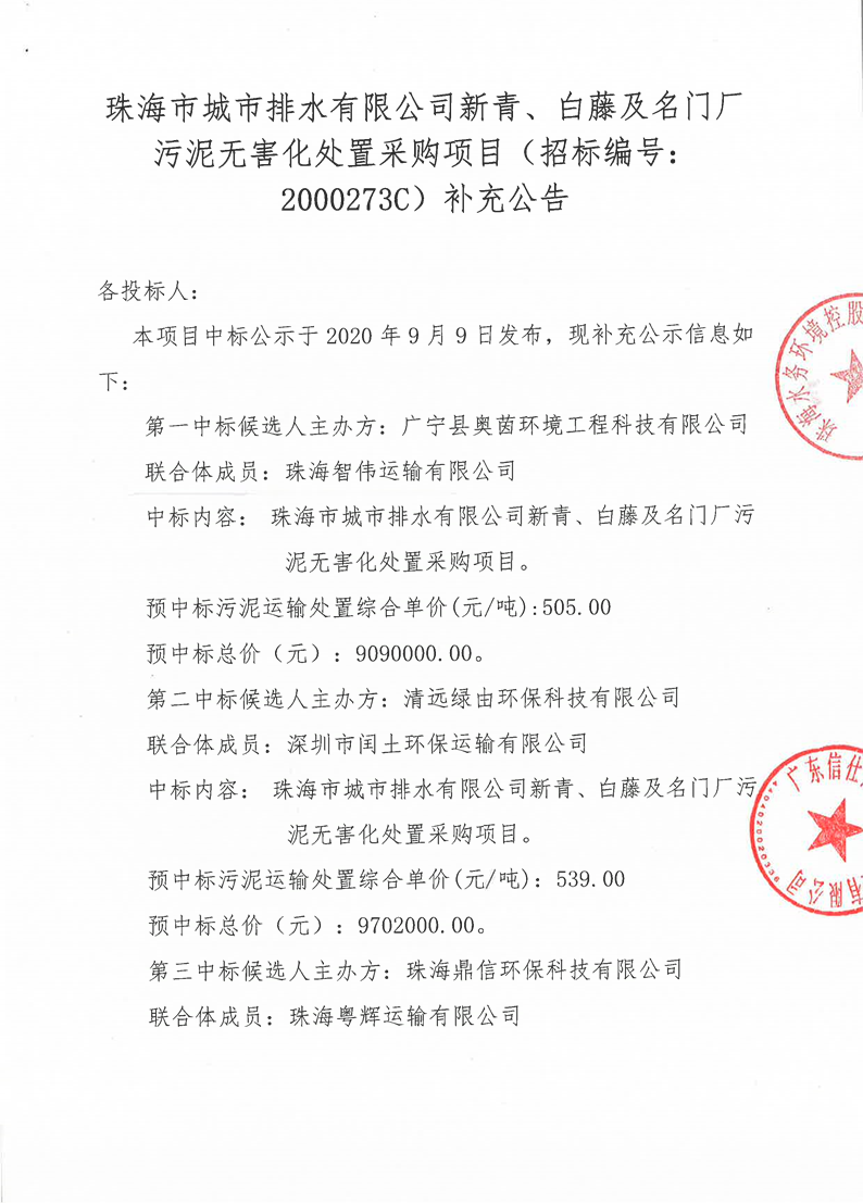 珠海市城市排水有限公司新青、白藤及名门厂污泥无害化处置采购项目补充公告